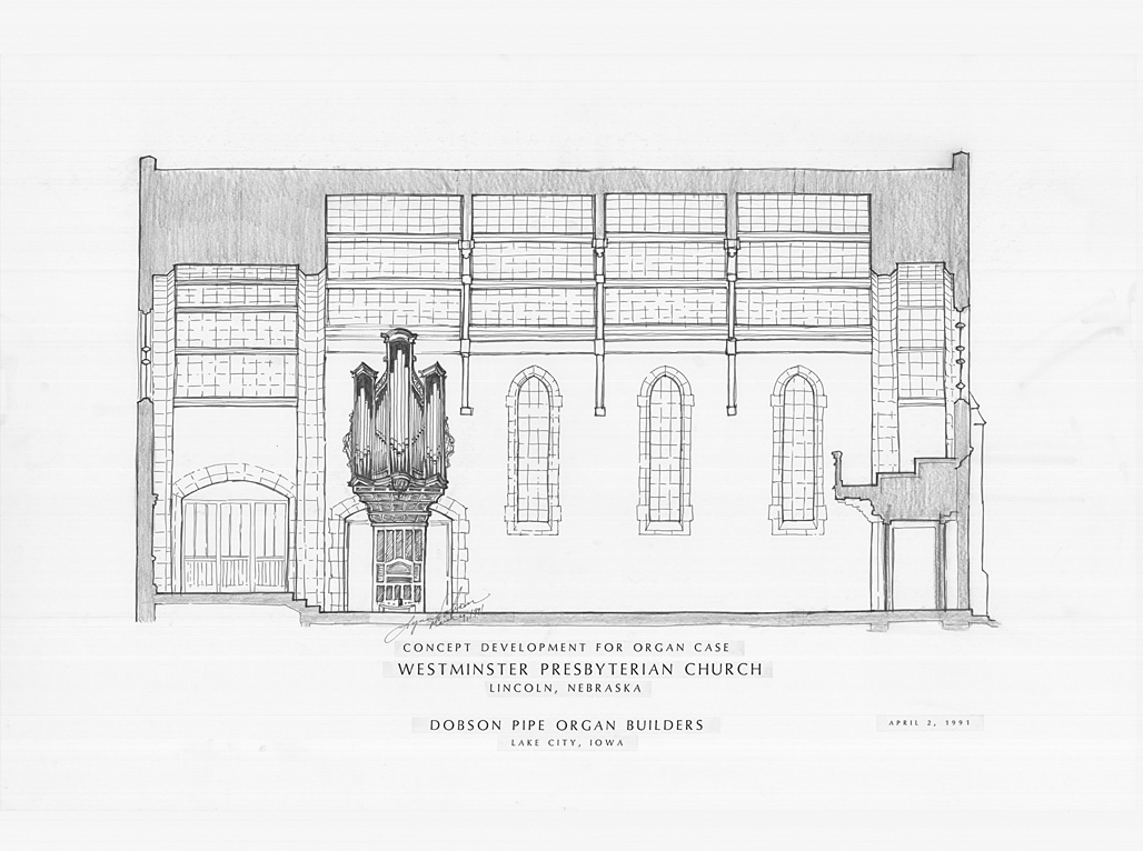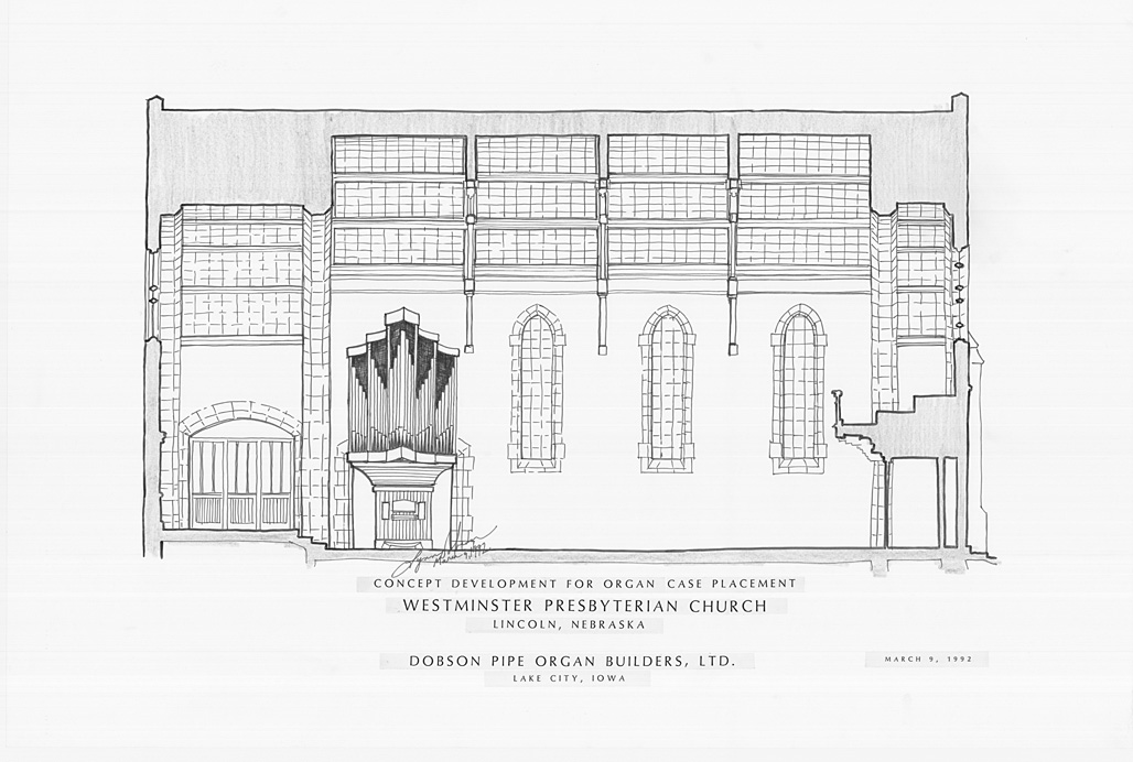 Concept Development for Organ Case Placement [A] Westminster Presbyterian Church, Lincoln, Nebraska March 9, 1992 Ink and pencil on vellum