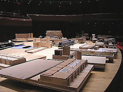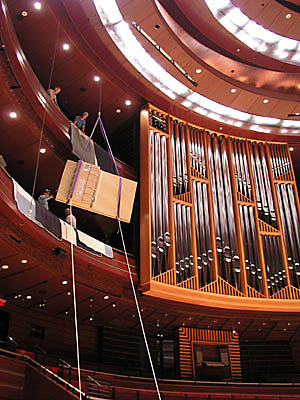 Here is the whole sequence of hoisting a windchest—in this case, one of the two Swell slider chests. The windchest is brought onto the stage, where the rigging is arranged.