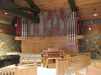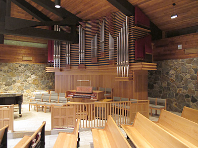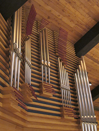 Because of its corner location, the organ case is folded in the middle, like a book. The Great is in the right half of the case, with the Swell on the left; both have mechanical action controlled from a detached console. The Subbass and full-length Fagotto are on electric action windchests. Other Op. 85 Photographs |