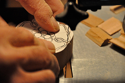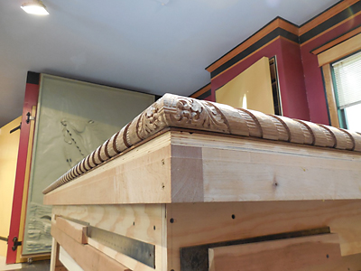 From a sample drawing like the one made by Lynn Dobson shown above, Denny carves a section of cresting.