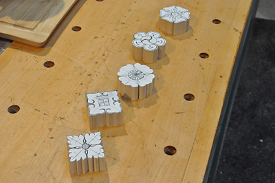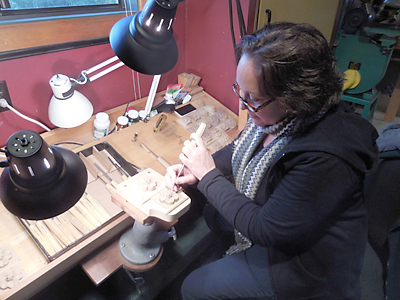 For each of these portraits, a model is made of basswood, a species that is soft and easily carved. The paper design is glued to the wood.