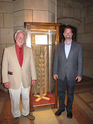 Lynn Dobson and Dennis Collier confer about the details of carved cresting as organ committee co-chair Karl Saunders looks on.