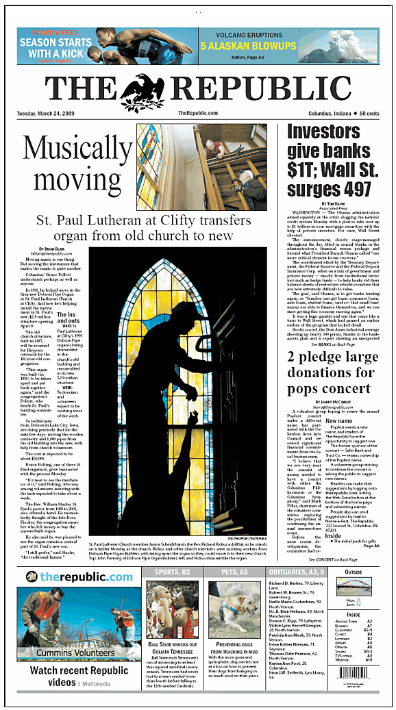 John Ourensma and John Panning spent a week and a half at St. Paul Lutheran Church in Columbus, Indiana, moving our Op. 54 to that church’s new building with the help of a host of volunteers. The project was covered on the front page of the 24 March 2009 issue of The Columbus Republic.
